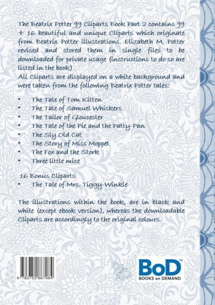 The Beatrix Potter 99 Cliparts Book Part 2 contains 99 + 16 beautiful and unique Cliparts which originate from Beatrix Potter illustrations. Elizabeth M. Potter revised and stored them in single files to be downloaded for private usage (instructions to do so are listed in the book).All Cliparts are displayed on a white background and were taken from the following Beatrix Potter tales:The Tale of Tom KittenThe Tale of Samuel WhiskersThe Tailor of GloucesterThe Tale of the Pie and the Patty-PanThe Sly Old CatThe Story of Miss MoppetThe Fox and the StorkThree little mice16 Bonus Cliparts The Tale of Mrs. Tiggy-WinkleThe illustrations within the book, are in black and white (except ebook version), whereas the downloadable Cliparts are accordingly to the original colours.