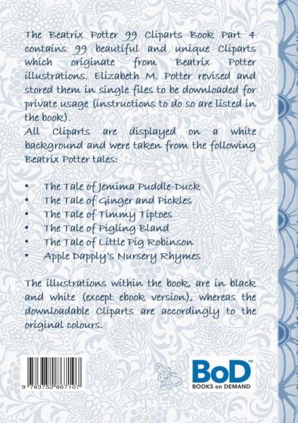 The Beatrix Potter 99 Cliparts Book Part 4 contains 99 beautiful and unique Cliparts which originate from Beatrix Potter illustrations. Elizabeth M. Potter revised and stored them in single files to be downloaded for private usage (instructions to do so are listed in the book).All Cliparts are displayed on a white background and were taken from the following Beatrix Potter tales:The Tale of Jemima Puddle-DuckThe Tale of Ginger and PicklesThe Tale of Timmy TiptoesThe Tale of Pigling BlandThe Tale of Little Pig RobinsonApple Dapply's Nursery RhymesThe illustrations within the book, are in black and white (except ebook version), whereas the downloadable Cliparts are accordingly to the original colours.