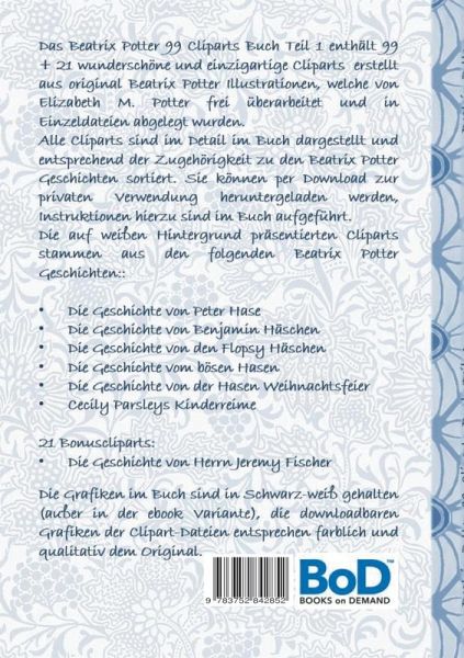 Das Beatrix Potter 99 Cliparts Buch Teil 1 enthält 99 + 21 wunderschöne und einzigartige Cliparts erstellt aus original Beatrix Potter Illustrationen, welche von Elizabeth M. Potter frei überarbeitet und in Einzeldateien abgelegt wurden.Alle Cliparts sind im Detail im Buch dargestellt und entsprechend der Zugehörigkeit zu den Beatrix Potter Geschichten sortiert. Sie können per Download zur privaten Verwendung heruntergeladen werden, Instruktionen hierzu sind im Buch aufgeführt. Die auf weißen Hintergrund präsentierten Cliparts stammen aus den folgenden Beatrix Potter Geschichten::Die Geschichte von Peter Hase Die Geschichte von Benjamin HäschenDie Geschichte von den Flopsy HäschenDie Geschichte vom bösen Hasen Die Geschichte von der Hasen WeihnachtsfeierCecily Parsleys Kinderreime 21 Bonuscliparts:Die Geschichte von Herrn Jeremy FischerDie Grafiken im Buch sind in Schwarzweiß gehalten (außer in der ebook Variante), die downloadbaren Grafiken der Clipart-Dateien entsprechen farblich und qualitativ dem Original.