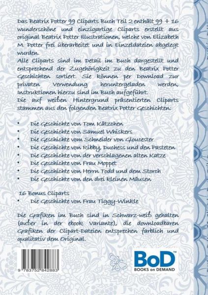 Das Beatrix Potter 99 Cliparts Buch Teil 2 enthält 99 + 16 wunderschöne und einzigartige Cliparts erstellt aus original Beatrix Potter Illustrationen, welche von Elizabeth M. Potter frei überarbeitet und in Einzeldateien abgelegt wurden.Alle Cliparts sind im Detail im Buch dargestellt und entsprechend der Zugehörigkeit zu den Beatrix Potter Geschichten sortiert. Sie können per Download zur privaten Verwendung heruntergeladen werden, Instruktionen hierzu sind im Buch aufgeführt. Die auf weißen Hintergrund präsentierten Cliparts stammen aus den folgenden Beatrix Potter Geschichten:Die Geschichte von Tom KätzchenDie Geschichte von Samuel WhiskersDie Geschichte vom Schneider von GloucesterDie Geschichte von Ribby, Duchess und den Pasteten Die Geschichte von der verschlagenen alten Katze Die Geschichte von Frau MoppetDie Geschichte von Herrn Todd und dem StorchDie Geschichte von den drei kleinen Mäusen16 Bonus Cliparts Die Geschichte von Frau Tiggy-WinkleDie Grafiken im Buch sind inSchwarz-weiß gehalten (außer in der ebook Variante), die downloadbaren Grafiken der Clipart-Dateien entsprechen farblich und qualitativ dem Original.