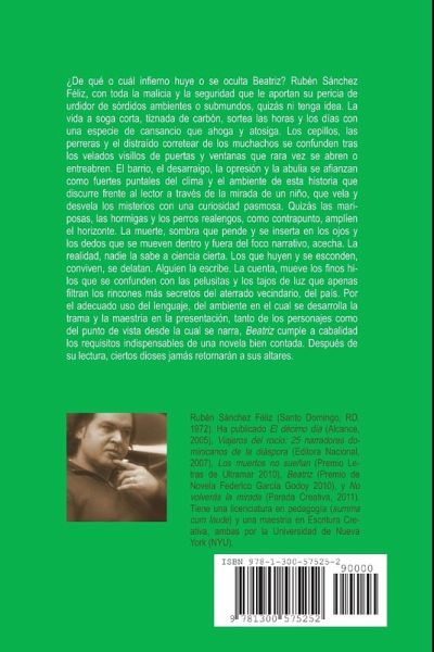 Por el adecuado uso del lenguaje, del ambiente en el cual se desarrolla la trama y la maestría en la presentación, tanto de los personajes como del punto de vista desde la cual se narra, Beatriz cumple a cabalidad los requisitos indispensables de una novela bien contada. Después de su lectura, ciertos dioses jamás retornarán a sus altares. Rubén Sánchez Féliz (Santo Domingo, RD, 1972). Educador, narrador y ensayista. Tiene publicadas las novelas El décimo día (Alcance, 2005), Los muertos no sueñan (Premio Letras de Ultramar 2010), Beatriz (Premio de Novela Federico García Godoy 2010), la antología de cuentos Viajeros del rocío: 25 narradores dominicanos de la diáspora (Editora Nacional, 2007) y el libro de cuentos No volverás la mirada (Parada Creativa, 2011). Obtuvo el segundo lugar en el Premio de ensayo Pedro Francisco Bonó 2010, con La palabra y otro ensayo. Tiene una licenciatura en pedagogía (summa cum laude) y una maestría en Escritura Creativa, ambas por la Universidad de Nueva York (NYU).