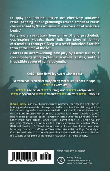 In 1994 the Criminal Justice Act effectively outlawed raves, banning public gatherings around amplified music characterised by 'the emission of a succession of repetitive beats.' Featuring a soundtrack from a live DJ and psychedelic 90s-inspired visuals, Beats tells the story of Johnno McCreadie, a teenager living in a small suburban Scottish town at the time of the Act. Beats is an award-winning new play by Kieran Hurley; a coming-of-age story exploring rebellion, apathy, and the irresistible power of gathered youth. Beats was the winner of Critics Awards for Theatre in Scotland, as well as the winner of The Arches Platform 18 Behaviour Award 2012. "A tremendous piece of storytelling that takes us back to 1994." Guardian "An outstanding show; clever, ruthless, compassionate, full of political insight... with a subtlety, humanity that takes the breath away." Scotsman "Hurley delivers the performance with an eye-popping intensity." Time Out London "An original, urgent piece of theatre." Telegraph "Deceptively brilliant." Herald "Theatre at its most vital and electrifying." Metro "A truly intelligent and magical performance." Edinburgh Evening News "Kieran's talent is seemingly endless: the poetic flow of his words against the busy background music...his expressions, and the descriptive content of the story are superb...Kieran is able to rile emotion from within, stirring excitement and suspense with just the use of his voice, and his choice of words.." The Upcoming