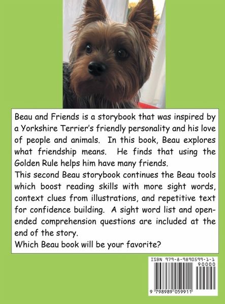 Beau and Friends is a storybook that was inspired by a Yorkshire Terrier's friendly personality and his love of people and animals. In this book, Beau explores what friendship means, He finds that using the Golden Rule helps him have many friends. The second Beau storybook continues the Beau tools which boost reading skills with more sight words, context clues from beautiful illustrations, and repetitive text for confidence building. A sight words list and open-ended comprehension questions are included at the end of the story as well as friendship quotes from Bible verses, famous Americans, an unknown, and an Irish Proverb. Beau and Friends is probably going to become your child's favorite storybook.