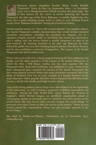 Baroness Emma Magdolna Rozália Mária Jozefa Borbála "Emmuska" Orczy de Orci (23 September 1865 – 12 November 1947) was a Hungarian-born British novelist and playwright. She is best known for her series of novels featuring the Scarlet Pimpernel, the alter ego of Sir Percy Blakeney, a wealthy English fop who turns into a quick-thinking escape artist in order to save ill-fated French royalty from "Madame Guillotine" during the French revolution. Introducing the notion of a "hero with a secret identity" into popular culture, the Scarlet Pimpernel exhibits characteristics that would become standard superhero conventions, including the penchant for disguise, use of a signature weapon (sword), ability to out-think and outwit his adversaries, and a calling card (he leaves behind a scarlet pimpernel at each of his interventions). By drawing attention to his alter ego Blakeney he hides behind his public face as a slow thinking foppish playboy (like Bruce Wayne), and he also establishes a network of supporters, The League of the Scarlet Pimpernel, that aid his endeavours. Orczy went on to write over a dozen sequels featuring Sir Percy Blakeney, his family, and the other members of the League of the Scarlet Pimpernel, of which the first, I Will Repay (1906), was the most popular. The last Pimpernel book, Mam'zelle Guillotine, was published in 1940. None of her three subsequent plays matched the success of The Scarlet Pimpernel. She also wrote popular mystery fiction and many adventure romances. Her Lady Molly of Scotland Yard was an early example of a female detective as the main character. Other popular detective stories featured The Old Man in the Corner, a sleuth who chiefly used logic to solve crimes. Orczy held strong political views. Orczy was a firm believer in the superiority of the aristocracy, as well as being a supporter of British imperialism and militarism. During the First World War, Orczy formed the Women of England's Active Service League, an unofficial organisation aimed at encouraging women to persuade men to volunteer for active service in the armed forces. Her aim was to enlist 100,000 women who would pledge "to persuade every man I know to offer his service to his country". Some 20,000 women joined her organisation. Orczy was also strongly opposed to the Soviet Union. She died in Henley-on-Thames, Oxfordshire on 12 November 1947. (wikipedia.org)