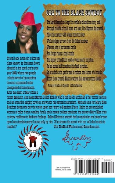 First book of Western Parables Adventure, Mystery, and Romance Series Travel back in time in a fictional place known as Tradassa Town situated in the south during the year 1881 where two people unbeknownst of one another become acquainted under unexpected circumstances. After the death of Mary Ellen's father Benjamin, she meets Nathan Jonah Hickey who is the hired ranchman of her father's estate and an attractive singing cowboy known for his genteel mannerism. Nathan's love for Mary Ellen Beauford begins the day they meet upon her return to Beauford Place. Being an accomplished woman of color from a wealthy family and a recent college graduate, the austere Mary Ellen tries to show resilience to Nathan's feelings. Behind Nathan's smooth dark complexion and deep brown eyes lies a terrible secret known only by him. If he shares his secret with her, will she be able to handle it? Will it destroy him? Visit Western Parable or TheBlackWest.com.