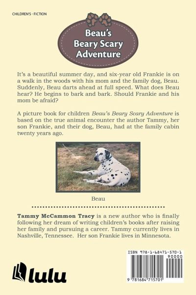 It's a beautiful summer day, and six-year old Frankie is on a walk in the woods with his mom and the family dog, Beau. Suddenly, Beau darts ahead at full speed. What does Beau hear? He begins to bark and bark. Should Frankie and his mom be afraid? A picture book for children Beau's Beary Scary Adventure is based on the true animal encounter the author Tammy, her son Frankie, and their dog, Beau, had at the family cabin twenty years ago.