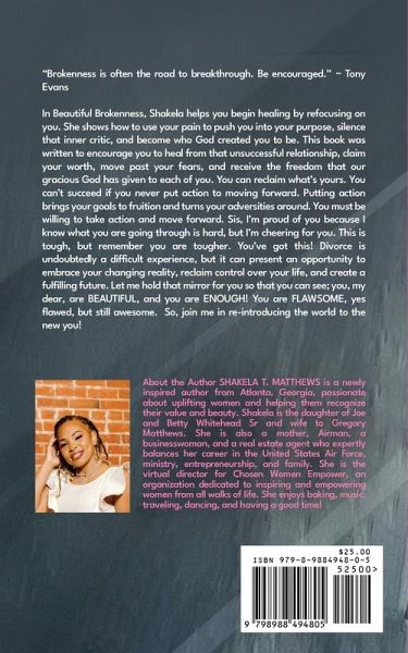 In Beautiful Brokenness, Shakela helps you begin healing by refocusing on you. She shows how to use your pain to push you into your purpose, silence that inner critic, and become who God created you to be. This book was written to encourage you to heal from that unsuccessful relationship, claim your worth, move past your fears, and receive the freedom that our gracious God has given to each of you. You can reclaim what's yours. You can't succeed if you never put action to moving forward. Putting action brings your goals to fruition and turns your adversities around. You must be willing to take action and move forward. Sis, I'm proud of you because I know what you are going through is hard, but I'm cheering for you. This is tough, but remember you are tougher. You've got this! Divorce is undoubtedly a difficult experience, but it can present an opportunity to embrace your changing reality, reclaim control over your life, and create a fulfilling future. Let me hold that mirror for you so that you can see; you, my dear, are BEAUTIFUL, and you are ENOUGH! You are FLAWSOME, yes flawed, but still awesome. So, join me in re-introducing the world to the new you!