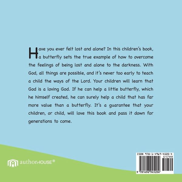 Have you ever felt lost and alone? In this children's book, a butterfly sets the true example of how to overcome the feelings of being lost and alone to the darkness. With God, all things are possible, and it's never too early to teach a child the ways of the Lord. Your children will learn that God is a loving God. If he can help a little butterfly, which he himself created, he can surely help a child that has far more value than a butterfly. It's a guarantee that your children, or child, will love this book and pass it down for generations to come.