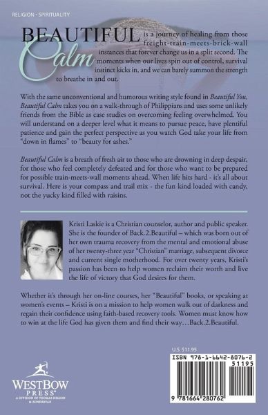 Beautiful Calm is a journey of healing from those freight-train-meets-brick-wall instances that forever change us in a split second. The moments when our lives spin out of control, survival instinct kicks in, and we can barely summon the strength to breathe in and out. With the same unconventional and humorous writing style found in Beautiful You, Beautiful Calm takes you on a walk-through of Philippians and uses some unlikely friends from the Bible as case studies on overcoming feeling overwhelmed. You will understand on a deeper level what it means to pursue peace, have plentiful patience and gain the perfect perspective as you watch God take your life from "down in flames" to "beauty for ashes." Beautiful Calm is a breath of fresh air to those who are drowning in deep despair, for those who feel completely defeated and for those who want to be prepared for possible train-meets-wall moments ahead. When life hits hard - it's all about survival. Here is your compass and trail mix - the fun kind loaded with candy, not the yucky kind filled with raisins.