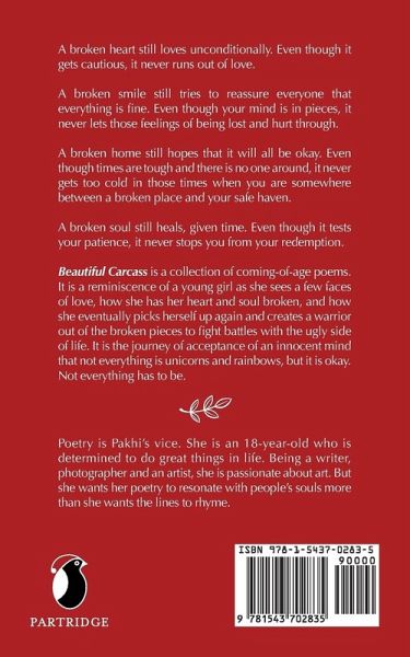 A broken heart still loves unconditionally. Even though it gets cautious, it never runs out of love. A broken smile still tries to reassure everyone that everything is fine. Even though your mind is in pieces, it never lets those feelings of being lost and hurt through. A broken home still hopes that it will all be okay. Even though times are tough and there is no one around, it never gets too cold in those times when you are somewhere between a broken place and your safe haven. A broken soul still heals, given time. Even though it tests your patience, it never stops you from your redemption. Beautiful Carcass is a collection of coming-of-age poems. It is a reminiscence of a young girl as she sees a few faces of love, how she has her heart and soul broken, and how she eventually picks herself up again and creates a warrior out of the broken pieces to fight battles with the ugly side of life. It is the journey of acceptance of an innocent mind that not everything is unicorns and rainbows, but it is okay. Not everything has to be.