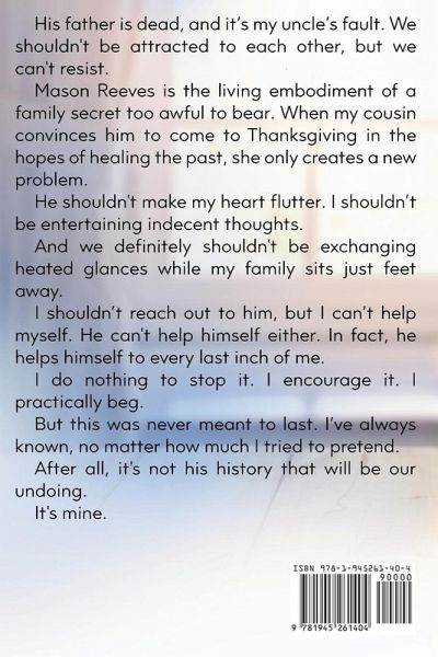 His father is dead, and it's my uncle's fault. We shouldn't be attracted to each other, but we can't resist. Mason Reeves is the living embodiment of a family secret too awful to bear. When my cousin convinces him to come to Thanksgiving in the hopes of healing the past, she only creates a new problem. He shouldn't make my heart flutter. I shouldn't be entertaining indecent thoughts. And we definitely shouldn't be exchanging heated glances while my family sits just feet away. I shouldn't reach out to him, but I can't help myself. He can't help himself either. In fact, he helps himself to every last inch of me. I do nothing to stop it. I encourage it. I practically beg. But this was never meant to last. I've always known, no matter how much I tried to pretend. After all, it's not his history that will be our undoing. It's mine.