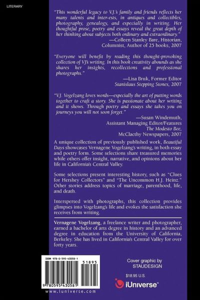 A unique collection of previously published work, Beautiful Days showcases Vernagene Vogelzang's writing, in both essay and poem form. Some selections share treasured memories while others offer insight, narrative, and opinions about her life in California's Central Valley. Some selections present interesting history, such as "Clues for Hershey Collectors" and "The Uncommon H.J. Heinz." Other stories address topics of marriage, parenthood, life, and death. Interspersed with photographs, this collection provides glimpses into Vogelzang's life and evokes the satisfaction she receives from writing.