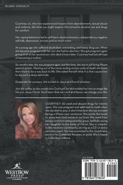 Courtney Jo, who has experienced trauma from abandonment, sexual abuse and violence, did what you might expect: She turned to alcohol, sex and drugs for comfort. Her coping behaviors led to self-harm, destructiveness, codependency, negative self-talk, depression, anxiety and so much more. At a young age she suffered alcoholism, overeating, and heavy drug use. When she became pregnant with her son she had an abortion. She got pregnant again giving birth to her second son, who died 2 hours later. Courtney had lost all hope of becoming a mother. Six months later she was pregnant again, but this time, she was in jail facing fifteen years in prison. Wanting out of the never ending vicious cycle of death she knew there had to be a way back to life. She asked herself what it is that caused her to dig such a deep dark hole. Desperate for answers, she turned to Jesus and found salvation. Join the author as she reveals how God took her and molded her into an image like His son, Jesus Christ. You'll learn that our Lord and Savior can change your life.