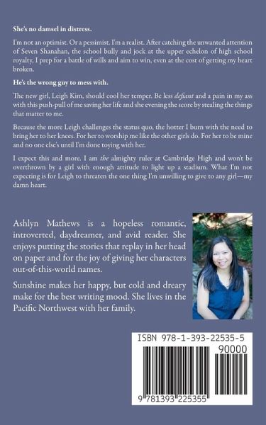 She's no damsel in distress. I'm not an optimist. Or a pessimist. I'm a realist. After catching the unwanted attention of Seven Shanahan, the school bully and jock at the upper echelon of high school royalty, I prep for a battle of wills and aim to win, even at the cost of getting my heart broken. He's the wrong guy to mess with. The new girl, Leigh Kim, should cool her temper. Be less defiant and a pain in my ass with this push-pull of me saving her life and she evening the score by stealing the things that matter to me. Because the more Leigh challenges the status quo, the hotter I burn with the need to bring her to her knees. For her to worship me like the other girls do. For her to be mine and no one else's until I'm done toying with her. I expect this and more. I am the almighty ruler at Cambridge High and won't be overthrown by a girl with enough attitude to light up a stadium. What I'm not expecting is for Leigh to threaten the one thing I'm unwilling to give to any girl-my damn heart.