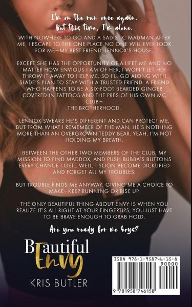 I'm on the run once again. But this time, I'm alone. With nowhere to go and a sadistic madman after me, I escape to the one place no one will ever look for me-my best friend, Lennox's house. Except she has the opportunity of a lifetime and no matter how envious I am of her, I won't let her throw it away to help me. So I'll go along with Slade's plan to stay with a trusted friend. A friend who happens to be a six-foot bearded ginger covered in tattoos and the Pres of his own MC club-the Brotherhood. Lennox swears he's different and can protect me, but from what I remember of the man, he's nothing more than an overgrown teddy bear. Yeah, I'm not holding my breath. Between the other two members of the club, my mission to find Maddox, and push Bubba's buttons every chance I get... Well, I soon become dickupied and forget all my troubles. But trouble finds me anyway, giving me a choice to make-keep running or rise up. The only beautiful thing about envy is when you realize it's all right at your fingertips, you just have to be brave enough to grab hold. Are you ready for me boys?