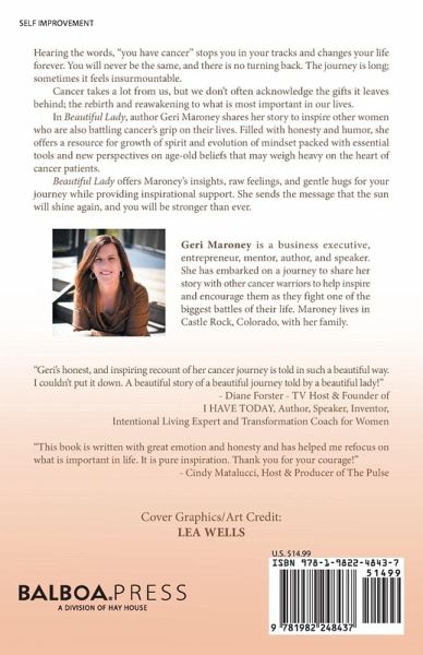 Hearing the words, "you have cancer" stops you in your tracks and changes your life forever. You will never be the same, and there is no turning back. The journey is long; sometimes it feels insurmountable. We are all intensely aware of the things that cancer takes from us, but we don't often acknowledge the gifts it leaves behind; the rebirth and reawakening to what is most important in our lives. In Beautiful Lady, author Geri Maroney shares her story to inspire other women who are also battling cancer's grip on their lives. Filled with honesty and humor, she offers a resource for growth of spirit and evolution of mindset packed with essential tools and new perspectives on age-old beliefs that may weigh heavy on the heart of cancer patients. Beautiful Lady offers Maroney's insights, raw feelings, and gentle hugs for your journey while providing inspirational support through scripture. She sends the message that the sun will shine again, and you will be stronger than ever. You will be the ultimate cancer warrior.