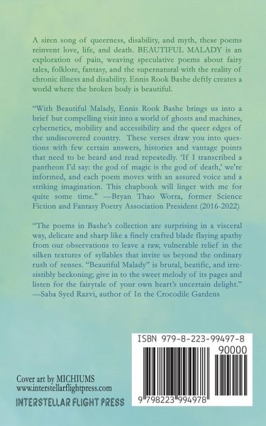 A siren song of queerness, disability, and myth, these poems reinvent love, life, and death. BEAUTIFUL MALADY is an exploration of pain, weaving speculative poems about fairy tales, folklore, fantasy, and the supernatural with the reality of chronic illness and disability. Ennis Rook Bashe deftly creates a world where the broken body is beautiful.