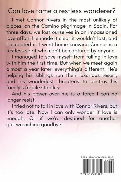 Can love tame a restless wanderer? I met Connor Rivers in the most unlikely of places—on the Camino pilgrimage in Spain. For three days, we lost ourselves in an impassioned love affair. He made it clear it wouldn’t last, and I accepted it. I went home knowing Connor is a restless spirit who can’t be captured by anyone. I managed to save myself from falling in love with him the first time. But when we meet again almost a year later, everything’s different. He’s helping his siblings run their luxurious resort, and his wanderlust threatens to destroy his family’s fragile stability. And his power over me is a force I can no longer resist. I tried not to fall in love with Connor Rivers, but it’s too late. Now I can only wonder if love is enough. Or if we’re destined for another gut-wrenching goodbye.
