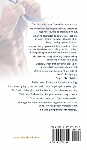 The first time I met Caine West was in a bar. He noticed me looking his way and mistakenly read my scowling as checking him out. When he attempted to talk to me, I set him straight―telling him what I thought of his lying, cheating, egomaniacal ass. You see, the gorgeous jerk had wined and dined my best friend-smooth talking her into his bed, all along failing to mention that he was married. He deserved every bit of my tongue-lashing and more for what he'd done. Especially when that lazy smile graced his perfect face in response to my rant. Only it turned out, the man I'd just told off wasn't the right guy. Oops. My mistake. Embarrassed, I slunk out without an apology. I was never going to see the handsome stranger again anyway, right? That's what I thought...until I walked into class the next morning. Well, hello Professor West, I'm your new teaching assistant. I'll be working under you...figuratively speaking. Although the literal interpretation might not be such a bad thing―working under Professor West. This was going to be interesting...