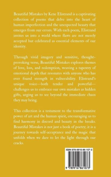 Beautiful Mistakes by Kene Elistrand is a captivating collection of poems that delve into the heart of human imperfection and the unexpected beauty that emerges from our errors. With each poem, Elistrand invites us into a world where flaws are not merely accepted but celebrated as essential elements of our identity. Through vivid imagery and sensitive, thought-provoking verse, Beautiful Mistakes explores themes of love, loss, and redemption, weaving a tapestry of emotional depth that resonates with anyone who has ever found strength in vulnerability. Elistrand's unique voice-both tender and powerful-challenges us to embrace our own mistakes as hidden gifts, urging us to see beyond the immediate chaos they may bring. This collection is a testament to the transformative power of art and the human spirit, encouraging us to find harmony in discord and beauty in the breaks. Beautiful Mistakes is not just a book of poetry; it is a journey towards self-acceptance and the magic that unfolds when we dare to let the light through our cracks. Copyright (c) 2024 Swan Charm Publishing