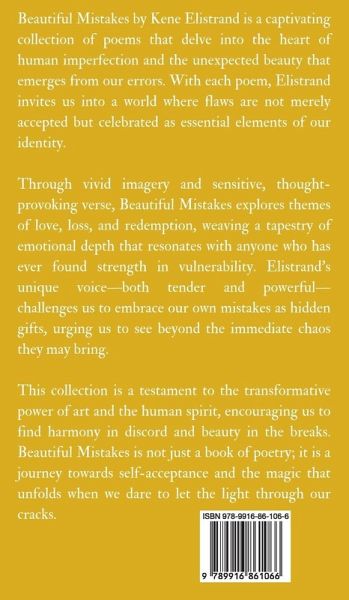Beautiful Mistakes by Kene Elistrand is a captivating collection of poems that delve into the heart of human imperfection and the unexpected beauty that emerges from our errors. With each poem, Elistrand invites us into a world where flaws are not merely accepted but celebrated as essential elements of our identity. Through vivid imagery and sensitive, thought-provoking verse, Beautiful Mistakes explores themes of love, loss, and redemption, weaving a tapestry of emotional depth that resonates with anyone who has ever found strength in vulnerability. Elistrand's unique voice-both tender and powerful-challenges us to embrace our own mistakes as hidden gifts, urging us to see beyond the immediate chaos they may bring. This collection is a testament to the transformative power of art and the human spirit, encouraging us to find harmony in discord and beauty in the breaks. Beautiful Mistakes is not just a book of poetry; it is a journey towards self-acceptance and the magic that unfolds when we dare to let the light through our cracks. Copyright (c) 2024 Swan Charm Publishing