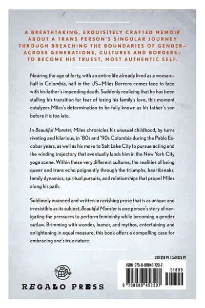 A breathtaking, exquisitely crafted memoir about a trans person's singular journey through breaching the boundaries of gender-across generations, cultures and borders-to become his truest, most authentic self. Nearing the age of forty, with an entire life already lived as a woman-half in Colombia, half in the US-Miles Borrero comes face to face with his father's impending death. Suddenly realizing that he has been stalling his transition for fear of losing his family's love, this moment catalyzes Miles's determination to be fully known as his father's son before it is too late. In Beautiful Monster, Miles chronicles his unusual childhood, by turns riveting and hilarious, in '80s and '90s Colombia during the Pablo Escobar years, as well as his move to Salt Lake City to pursue acting and the winding trajectory that eventually lands him in the New York City yoga scene. Within these very different cultures, the realities of being queer and trans echo poignantly through the triumphs, heartbreaks, family dynamics, spiritual pursuits, and relationships that propel Miles along his path. Sublimely nuanced and written in ravishing prose that is as unique and irresistible as its subject, Beautiful Monster is one person's story of navigating the pressures to perform femininity while becoming a gender outlaw. Brimming with wonder, humor, and mythos, entertaining and enlightening in equal measure, this book offers a compelling case for embracing one's true nature.