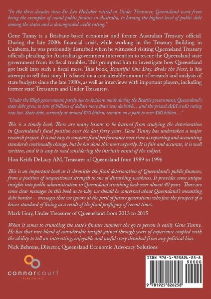 Gene Tunny is a Brisbane-based economist and former Australian Treasury official. During the late 2000s financial crisis, while working in the Treasury Building in Canberra, he was profoundly disturbed when he witnessed visiting Queensland Treasury officials pleading for Australian government intervention to rescue the Queensland state government from its fiscal troubles. This prompted him to investigate how Queensland got itself into such a fiscal mess. This book, Beautiful One Day, Broke the Next, is his attempt to tell that story. It is based on a considerable amount of research and analysis of state budgets since the late 1980s, as well as interviews with important players, including former state Treasurers and Under Treasurers.