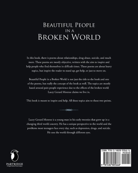 In this book, there is poems about relationships, drug abuse, suicide, and much more. These poems are mostly objective, written with the aim to inspire and help people who find themselves in difficult times. These poems are about heavy topics, but inspire the reader to stand up, get help, or just to move on. Beautiful People in a Broken World is not just the title to the book and one of the poems, but really the concept of the book as well. The topics are mostly based around pain people experience due to the effects of the broken world Lacey Gerard Monroe claims we live in. This book is meant to inspire and help. All these topics aim to those two points.