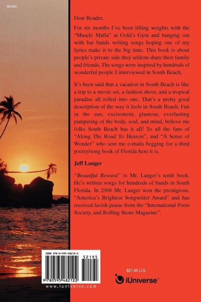 Dear Reader, For six months I've been lifting weights with the "Muscle Mafia" at Gold's Gym and hanging out with bar bands writing songs hoping one of my lyrics make it to the big time. This book is about people's private side they seldom share their family and friends. The songs were inspired by hundreds of wonderful people I interviewed in South Beach. It's been said that a vacation in South Beach is like a trip to a movie set, a fashion shoot, and a tropical paradise all rolled into one. That's a pretty good description of the way it feels in South Beach. Fun in the sun, excitement, glamour, everlasting pampering of the body, soul, and mind, believe me folks South Beach has it all! To all the fans of "Along The Road To Heaven", and "A Sense of Wonder" who sent me e-mails begging for a third poetry/song book of Florida here it is. Jeff Langer "Beautiful Reward" is Mr. Langer's tenth book. He's written songs for hundreds of bands in South Florida. In 2006 Mr. Langer won the prestigious, "America's Brightest Songwriter Award" and has received lavish praise from the "International Poets Society, and Rolling Stone Magazine".