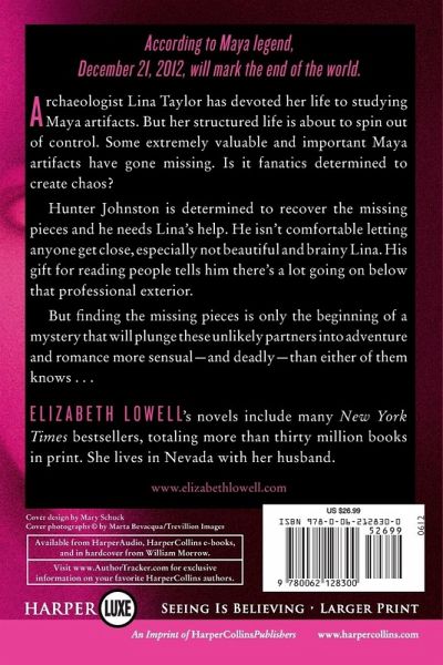 According to Maya legend, December 21, 2012, will mark the end of the world as we know it. Is it myth . . . or will their prediction become reality? Archaeologist Lina Taylor has devoted her life to studying ancient Maya artifacts, splitting her time between digs in South America and the classroom teaching college students. But the professor's structured, academic life is about to spin out of control. Some extremely valuable and important Maya artifacts have gone missing. Are the culprits fanatics determined to create chaos and usher in annihilation? Helping out a friend, former immigration and customs enforcement officer Hunter Johnston is determined to recover the missing pieces and he needs Lina's help. A man used to calling the shots and working alone, he isn't comfortable letting anyone get close, especially a beautiful and brainy woman like Lina. His gift for reading people tells him there's a lot going on below that professional exterior, and he's more than a little curious to probe her depths. Burying herself in her work, Lina's had little experience handling men, especially one as fascinating and exasperating as the secretive, headstrong Hunter. A devoted archaeologist, she has the skill to excavate those protective layers all the way to his core. But finding the missing artifacts is only the beginning of a mystery that will plunge these unlikely partners into adventure, romance, and danger more thrilling, sensual, and deadly than either of them knows. . . .