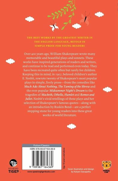 The best works by the greatest writer in the English language, retold in simple prose for young readers. Over 400 years ago, William Shakespeare wrote many memorable and beautiful plays and sonnets. These works have inspired generations of readers and writers, and continue to be read and performed even today. They have been recreated quite often but rarely for children. Keeping this in mind, in 1907, beloved children's author E. Nesbit, rewrote twenty of Shakespeare's most popular plays in simple, lively prose-from the comedies like Much Ado About Nothing, The Taming of the Shrew and the ever-popular Midsummer Night's Dream to the tragedies of Macbeth, Othello, Hamlet and Romeo and Juliet. Nesbit's vivid retellings of these plays and her selection of Shakespeare's famous quotes-along with an introduction by Ruskin Bond-are a perfect stepping stone for young readers into these great works of world literature.