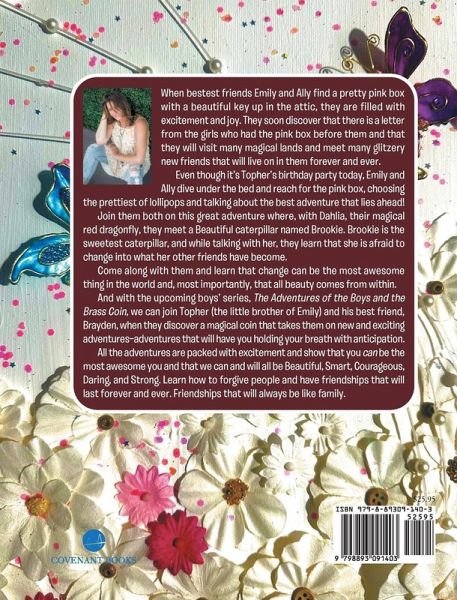 When bestest friends Emily and Ally find a pretty pink box with a beautiful key up in the attic, they are filled with excitement and joy. They soon discover that there is a letter from the girls who had the pink box before them and that they will visit many magical lands and meet many glitzery new friends that will live on in them forever and ever. Even though it's Topher's birthday party today, Emily and Ally dive under the bed and reach for the pink box, choosing the prettiest of lollipops and talking about the best adventure that lies ahead! Join them both on this great adventure where, with Dahlia, their magical red dragonfly, they meet a Beautiful caterpillar named Brookie. Brookie is the sweetest caterpillar, and while talking with her, they learn that she is afraid to change into what her other friends have become. Come along with them and learn that change can be the most awesome thing in the world and, most importantly, that all beauty comes from within. And with the upcoming boys' series, The Adventures of the Boys and the Brass Coin, we can join Topher (the little brother of Emily) and his best friend, Brayden, when they discover a magical coin that takes them on new and exciting adventures--adventures that will have you holding your breath with anticipation. All the adventures are packed with excitement and show that you can be the most awesome you and that we can and will all be Beautiful, Smart, Courageous, Daring, and Strong. Learn how to forgive people and have friendships that will last forever and ever. Friendships that will always be like family.