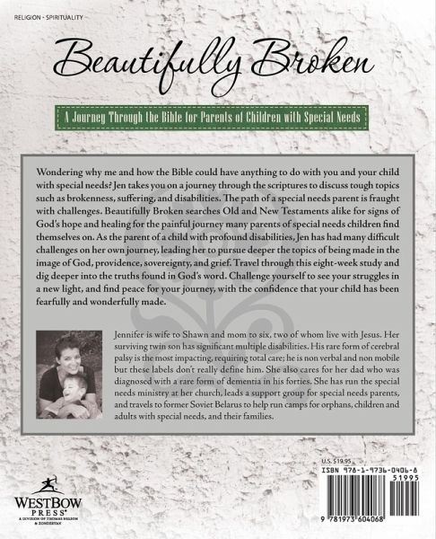 Wondering why me and how the Bible could have anything to do with you and your child with special needs? Jen takes you on a journey through the scriptures to discuss tough topics such as brokenness, suffering, and disabilities. The path of a special-needs parent is fraught with challenges. Beautifully Broken searches Old and New Testaments alike for signs of God's hope and healing for the painful journey many parents of special needs children find themselves on. As the parent of a child with profound disabilities, Jen has had many difficult challenges on her own journey, leading her to pursue deeper the topics of being made in the image of God, providence, sovereignty, and grief. Travel through this eight-week study and dig deeper into the truths found in God's word. Challenge yourself to see your struggles in a new light, and find peace for your journey, with the confidence that your child has been fearfully and wonderfully made.