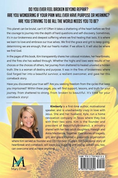 This planet can be brutal, can't it? Often it takes a shattering of the heart before we find the courage to journey into the depth of hard questions and self-discovery. Sometimes, it's in our brokenness and deepest suffering where we find healing that lasts. It is where we learn to love and embrace our true selves. We find the grace and grit to keep going, determining we are enough, that our hearts matter. If we allow it, it will also be where we find God. In the pages of this book, Kim transparently shares her colossal mistakes, her heartbreaks, and the fires she has walked through. Whether the highs and lows were results of her choices or the choices of others, her journey from shattered to healed unveiled a hidden truth. She is a woman of destiny and purpose. It was in the fires of brokenness where God forged her into a beautiful survivor, a resilient overcomer, and gave her this comeback story. Have you discovered your true self? Are you seeking freedom from the cycles that keep you imprisoned? Within these pages, you will find support, lessons, and truth for your journey. From shattered to strong. From broken to beautiful. It's time for your comeback story!