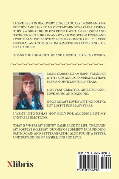 I HAVE BEEN IN RECOVERY SINCE JANUARY 16 2020 AND MY POETRY CAME BACK TO ME ONCE MY MIND WAS CLEAR. I THINK THIS IS A GREAT BOOK FOR PEOPLE WITH DEPRESSION AND TRYING TO GET SOBER IN ANY WAY. I HAVE OVER 45 POEMS AND I WRITE ALMOST EVERYDAY AS THEY COME TO ME. IT IS VERY NATURAL AND COMES FROM SOMETHING I EXPERIENCE OR HEAR AND SEE. THANK YOU FOR YOUR TIME AND I HOPE YOU LOVE MY WORDS.