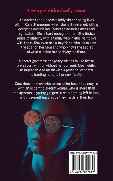 A teen girl with a deadly secret. An uncontrollably violent being lives within Cara and emerges when she is threatened, killing everyone around her. Between homelessness and high school, life presents constant hardship. Cara finds stability and hope when the Samuelsons take her in. Her boyfriend, Adam, looks past the scar on her face and recognizes Cara's beauty. His loyalty to her never fails. Together, they learn the ancient origin of the destructive force within her and embark on an unforgettable adventure of rescue and survival. A secret government agency wants Cara as a weapon, with or without her consent. Meanwhile, an implacable assassin with a personal vendetta hunts Cara and her new family. Other than Adam, Cara doesn't know who to trust. Her best hope may lie with an eccentric elderly woman, a girl genius with nothing left to lose, and ... a unique creation developed in their lab.