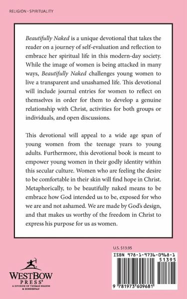 Beautifully Naked is a unique devotional that takes the reader on a journey of self-evaluation and reflection to embrace her spiritual life in this modern-day society. While the image of women is being attacked in many ways, Beautifully Naked challenges young women to live a transparent and unashamed life. This devotional will include journal entries for women to reflect on themselves in order for them to develop a genuine relationship with Christ, activities for both groups or individuals, and open discussions. This devotional will appeal to a wide age span of young women from the teenage years to young adults. Furthermore, this devotional book is meant to empower young women in their godly identity within this secular culture. Women who are feeling the desire to be comfortable in their skin will find hope in Christ. Metaphorically, to be beautifully naked means to be embrace how God intended us to be, exposed for who we are and not ashamed. We are made by God's design, and that makes us worthy of the freedom in Christ to express his purpose for us as women.