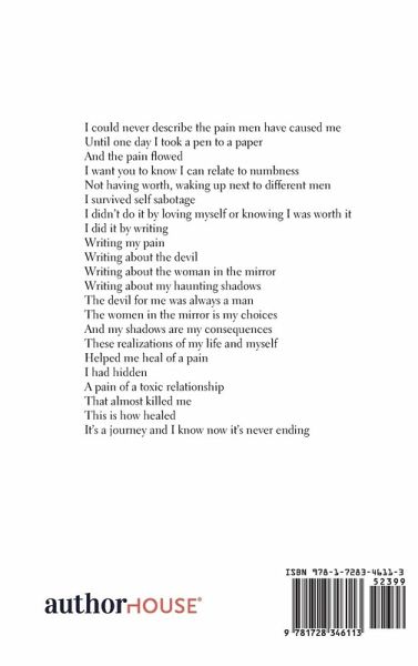 I could never describe the pain men have caused me Until one day I took a pen to a paper And the pain flowed I want you to know I can relate to numbness Not having worth, waking up next to different men I survived self sabotage I didn't do it by loving myself or knowing I was worth it I did it by writing Writing my pain Writing about the devil Writing about the woman in the mirror Writing about my haunting shadows The devil for me was always a man The women in the mirror is my choices And my shadows are my consequences These realizations of my life and myself Helped me heal of a pain I had hidden A pain of a toxic relationship That almost killed me This is how healed It's a journey and I know now it's never ending