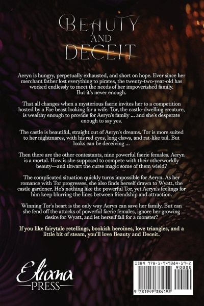 BEAUTY AND THE BEAST meets THE BACHELOR / THE SELECTION. Aeryn is hungry, perpetually exhausted, and short on hope. Ever since her merchant father lost everything to pirates, the twenty-two-year-old has worked endlessly to meet the needs of her impoverished family. But it's never enough. That all changes when a mysterious faerie invites her to a competition hosted by a Fae beast looking for a wife. Tor, the castle-dwelling creature, is wealthy enough to provide for Aeryn's family ... and she's desperate enough to say yes. The castle is beautiful, straight out of Aeryn's dreams. Tor is more suited to her nightmares, with his red eyes, long claws, and rat-like tail. But looks can be deceiving ... Then there are the other contestants, nine powerful faerie females. Aeryn is a mortal. How is she supposed to compete with their otherworldly beauty-and thwart the curse magic some of them wield? The complicated situation quickly turns impossible for Aeryn. As her romance with Tor progresses, she also finds herself drawn to Wyatt, the castle gardener. He's nothing like the powerful Tor, yet Aeryn's feelings for him keep blurring the lines between friendship and attraction. Winning Tor's heart is the only way Aeryn can save her family. But can she fend off the attacks of powerful faerie females, ignore her growing desire for Wyatt, and let herself fall for a monster? If you like fairytale retellings, bookish heroines, love triangles, and a little bit of steam, you'll love Beauty and Deceit. Buy it now! *** This story is romantic, and there's mild steam. The intimacy is open door but with minimal explicit detail. Written for NA (new adult) audiences, appropriate for ages 16+.