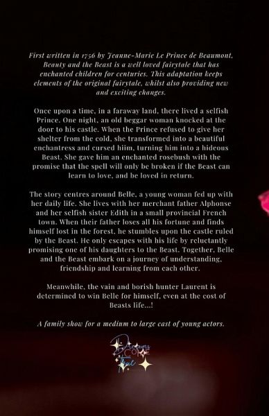 First written in 1756 by Jeanne-Marie Le Prince de Beaumont, Beauty and the Beast is a well loved fairytale that has enchanted children for centuries. This adaptation keeps elements of the original fairytale, whilst also providing new and exciting changes. Once upon a time, in a faraway land, there lived a selfish Prince. One night, an old beggar woman knocked at the door to his castle. When the Prince refused to give her shelter from the cold, she transformed into a beautiful enchantress and cursed hiim, turning him into a hideous Beast. She gave him an enchanted rosebush with the promise that the spell will only be broken if the Beast can learn to love, and be loved in return. The story centres around Belle, a young woman fed up with her daily life. She lives with her merchant father Alphonse and her selfish sister Edith in a small provincial French town. When their father loses all his fortune and finds himself lost in the forest, he stumbles upon the castle ruled by the Beast. He only escapes with his life by reluctantly promising one of his daughters to the Beast. Together, Belle and the Beast embark on a journey of understanding, friendship and learning from each other. Meanwhile, the vain and borish hunter Laurent is determined to win Belle for himself, even at the cost of Beasts life...! A family show for a medium to large cast of young actors.