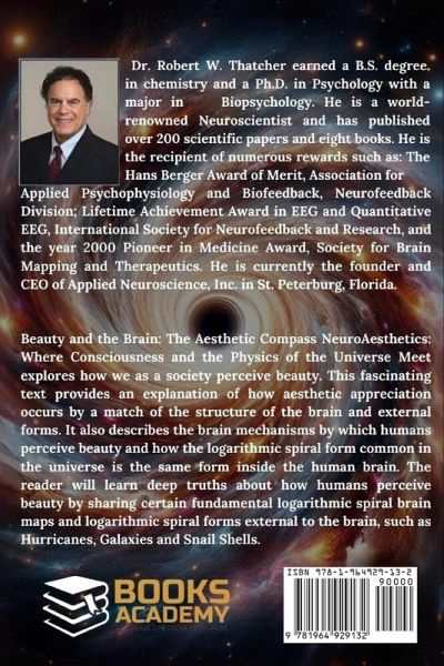 Dr. Robert W. Thatcher earned a B.S. degree, in chemistry and a Ph.D. in Psychology with a major in Biopsychology. He is a world- renowned Neuroscientist and has published over 200 scientific papers and eight books. He is the recipient of numerous rewards such as: The Hans Berger Award of Merit, Association for Applied Psychophysiology and Biofeedback, Neurofeedback Division; Lifetime Achievement Award in EEG and Quantitative EEG, International Society for Neurofeedback and Research, and the year 2000 Pioneer in Medicine Award, Society for Brain Mapping and Therapeutics. He is currently the founder and CEO of Applied Neuroscience, Inc. in St. Peterburg, Florida. Beauty and the Brain: The Aesthetic Compass NeuroAesthetics: Where Consciousness and the Physics of the Universe Meet explores how we as a society perceive beauty. This fascinating text provides an explanation of how aesthetic appreciation occurs by a match of the structure of the brain and external forms. It also describes the brain mechanisms by which humans perceive beauty and how the logarithmic spiral form common in the universe is the same form inside the human brain. The reader will learn deep truths about how humans perceive beauty by sharing certain fundamental logarithmic spiral brain maps and logarithmic spiral forms external to the brain, such as Hurricanes, Galaxies and Snail Shells.