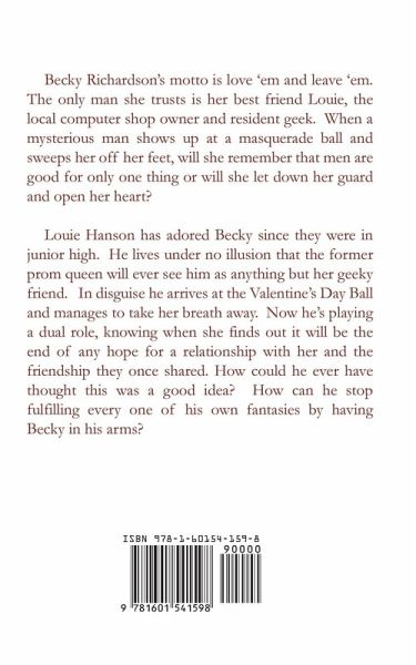 Becky Richardson's motto is love 'em and leave 'em. The only man she trusts is her best friend Louie, the local computer shop owner and resident geek. When a mysterious man shows up at a masquerade ball and sweeps her off her feet, will she remember that men are good for only one thing or will she let down her guard and open her heart? Louie Hanson has adored Becky since they were in junior high. He lives under no illusion that the former prom queen will ever see him as anything but her geeky friend. In disguise he arrives at the Valentine's Day Ball and manages to take her breath away. Now he's playing a dual role, knowing when she finds out it will be the end of any hope for a relationship with her and the friendship they once shared. How could he ever have thought this was a good idea? How can he stop fulfilling every one of his own fantasies by having Becky in his arms?