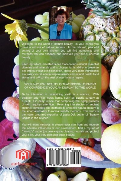 Welcome to the world of natural beauty. In your hands you have a volume of natural secrets. In the relaxed, peaceful setting of your own kitchen, you will find ingredients and methods that can enhance and maintain your skin's inherent beauty. Each ingredient indicated is one that contains natural essential vitamins and minerals and is chosen for its ability to preserve and improve your skin's condition. These very same ingredients are easily found in local supermarkets and natural health food stores and will cut the cost of your beauty regime. YOUR NATURAL BEAUTY IS THAT SPECIAL ELEMENT OF CONFIDENCE YOU CAN DISPLAY TO THE WORLD To be interested in maintaining youth is a science. With pollution and "hot" news items, such as plastic surgery at a peak, it is easy to see that postponing the aging process of skin requires attention. Reaching into studies of ancient cultures, remedies and methods to enhance natural beauty is the smart alternative to radical worldly methods. This study is the major area and expertise of Lusia Del, author of "Beauty Begins in the Kitchen." You will learn methods to protect your skin from and reverse the adverse influences of our environment, find a myriad of "how-to's" and enjoy new ways to cleanse, nourish and protect your skin, your very personal outer beauty.