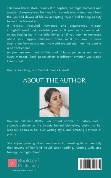 ""This book has in store, poems that capture nostalgic moments and wonderful experiences from my life. It sheds insight into how I face the ups and downs of life by accepting myself and finding beauty behind the blemishes. It reveals treasured memories and experiences through straightforward and relatable poems. If you are a person who enjoys finding joy in the little things, or if you want to reminisce about your happier childhood times, or if you love to draw inspiration from nature and the world around you, then this book is a perfect choice. As you turn each leaf of this book, I hope you enjoy and relive every moment. Each poem offers a different emotion you would love to feel. Happy, Touching, and Soulful Poems Ahead!""