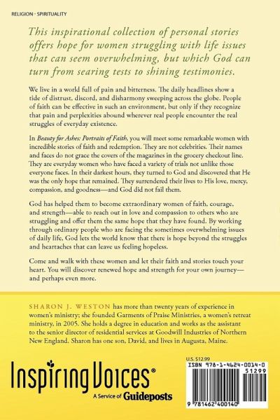 We live in a world full of pain and bitterness. The daily headlines show a tide of distrust, discord, and disharmony sweeping across the globe. People of faith can be effective in such an environment, but only if they recognize that pain and perplexities abound wherever real people encounter the real struggles of everyday existence. In Beauty for Ashes: Portraits of Faith, you will meet some remarkable women with incredible stories of faith and redemption. They are not celebrities. Their names and faces do not grace the covers of the magazines in the grocery checkout line. They are everyday women who have faced a variety of trials not unlike those everyone faces. In their darkest hours, they turned to God and discovered that he was the only hope that remained. They surrendered their lives to his love, mercy, compassion, and goodness-and God did not fail them. God has helped them to become extraordinary women of faith, courage, and strength-able to reach out in love and compassion to others who are struggling and offer them the same hope that they have found. By working through ordinary people who are facing the sometimes overwhelming issues of daily life, God lets the world know that there is hope beyond the struggles and heartaches that can leave us feeling hopeless. Come and walk with these women and let their faith and stories touch your heart. You will discover renewed hope and strength for your own journey-and perhaps even more.