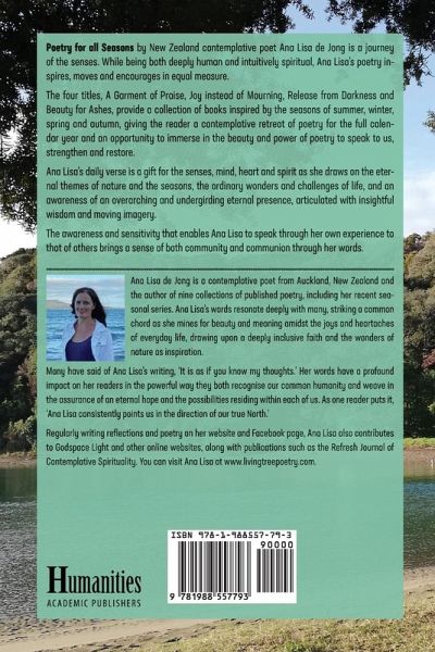 Poetry for all Seasons by New Zealand contemplative poet Ana Lisa de Jong is a journey of the senses. While being both deeply human and intuitively spiritual, Ana Lisa's poetry inspires, moves and encourages in equal measure. The four titles, A Garment of Praise, Joy instead of Mourning, Release from Darkness and Beauty for Ashes, provide a collection of books inspired by the seasons of summer, winter, spring and autumn, giving the reader a contemplative retreat of poetry for the full calendar year and an opportunity to immerse in the beauty and power of poetry to speak to us, strengthen and restore. Ana Lisa's daily verse is a gift for the senses, mind, heart and spirit as she draws on the eternal themes of nature and the seasons, the ordinary wonders and challenges of life, and an awareness of an overarching and undergirding eternal presence, articulated with insightful wisdom and moving imagery. The awareness and sensitivity that enables Ana Lisa to speak through her own experience to that of others brings a sense of both community and communion through her words.