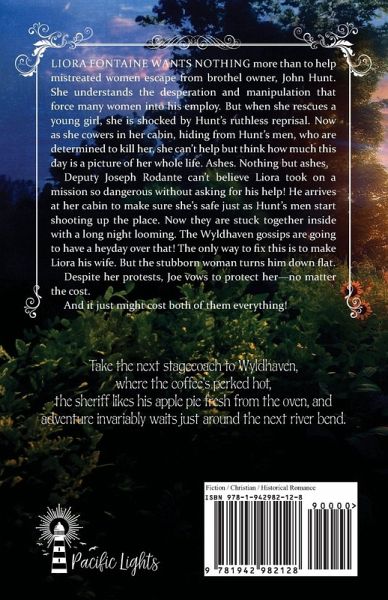 Liora Fontaine wants nothing more than to help mistreated women escape from brothel owner, John Hunt. She understands the desperation and manipulation that force many women into his employ. But when she rescues a young girl, she is shocked by Hunt's ruthless reprisal. Now as she cowers in her cabin, hiding from Hunt's men, who are determined to kill her, she can't help but think how much this day is a picture of her whole life. Ashes. Nothing but ashes. Deputy Joseph Rodante can't believe Liora took on a mission so dangerous without asking for his help! He arrives at her cabin to make sure she's safe just as Hunt's men start shooting up the place. Now they are stuck together inside with a long night looming. The Wyldhaven gossips are going to have a heyday over that! The only way to fix this is to make Liora his wife. But the stubborn woman turns him down flat. Despite her protests, Joe vows to protect her-no matter the cost. And it just might cost both of them everything! Take the next stagecoach to Wyldhaven, where the coffee's perked hot, the sheriff likes his apple pie fresh from the oven, and adventure invariably waits just around the next river bend.