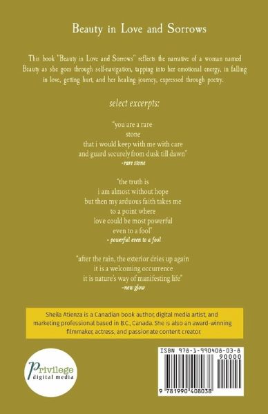 This book "Beauty in Love and Sorrows" reflects the narrative of a woman named Beauty as she goes through self-navigation, tapping into her emotional energy, in falling in love, getting hurt, and her healing journey, expressed through poetry. select excerpts: "you are a rare stone that i would keep with me with care and guard securely from dusk till dawn" - rare stone "the truth is i am almost without hope but then my arduous faith takes me to a point where love could be most powerful even to a fool" - powerful even to a fool "after the rain, the exterior dries up again it is a welcoming occurrence it is nature's way of manifesting life" - new glow