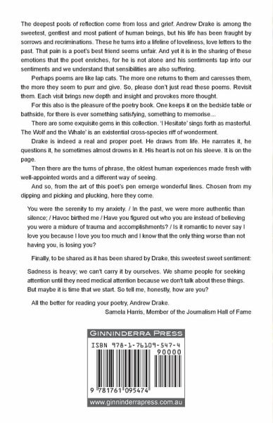 'The deepest pools of reflection come from loss and grief. Andrew Drake is among the sweetest, gentlest and most patient of human beings, but his life has been fraught by sorrows and recriminations. These he turns into a lifeline of loveliness, love letters to the past. That pain is a poet's best friend seems unfair. And yet it is in the sharing of these emotions that the poet enriches, for he is not alone and his sentiments tap into our sentiments and we understand that sensibilities are also suffering.' - Samela Harris, Member of the Journalism Hall of Fame
