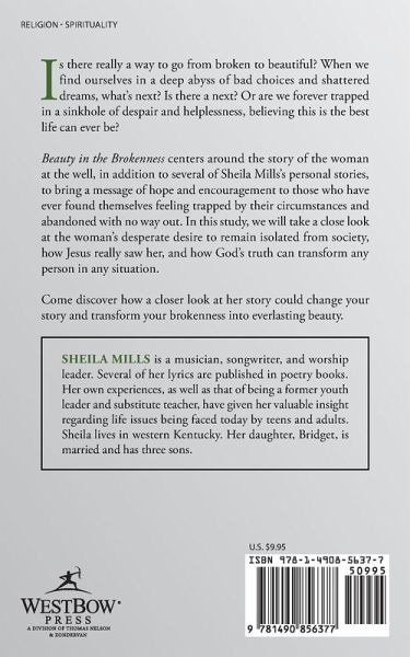 Is there really a way to go from broken to beautiful? When we find ourselves in a deep abyss of bad choices and shattered dreams, what?s next? Is there a next? Or are we forever trapped in a sinkhole of despair and helplessness, believing this is the best life can ever be? Beauty in the Brokenness centers around the story of the woman at the well, in addition to several of Sheila Mills?s personal stories, to bring a message of hope and encouragement to those who have ever found themselves feeling trapped by their circumstances and abandoned with no way out. In this study, we will take a close look at the woman?s desperate desire to remain isolated from society, how Jesus really saw her, and how God?s truth can transform any person in any situation. Come discover how a closer look at her story could change your story and transform your brokenness into everlasting beauty.